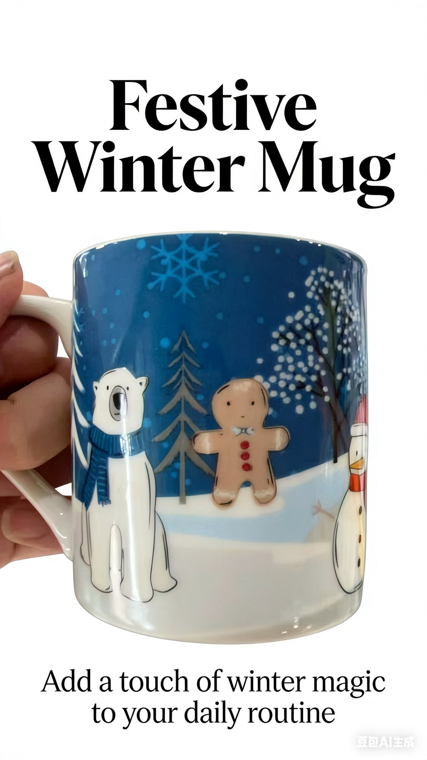 • Original winter snow scene print with polar bear, gingerbread man & snowman, full of Christmas vibe, super stylish