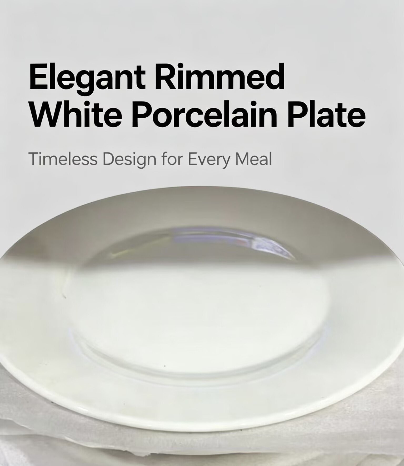 Upgrade every meal with our Elegant Rimmed White Porcelain Plate. Featuring a refined, raised rim and a smooth, glossy finish, this plate brings a touch of classic sophistication to your dining table. Ideal for home use, restaurants, cafes, or events, its versatile design pairs perfectly with any cuisine, from everyday meals to special occasion feasts.