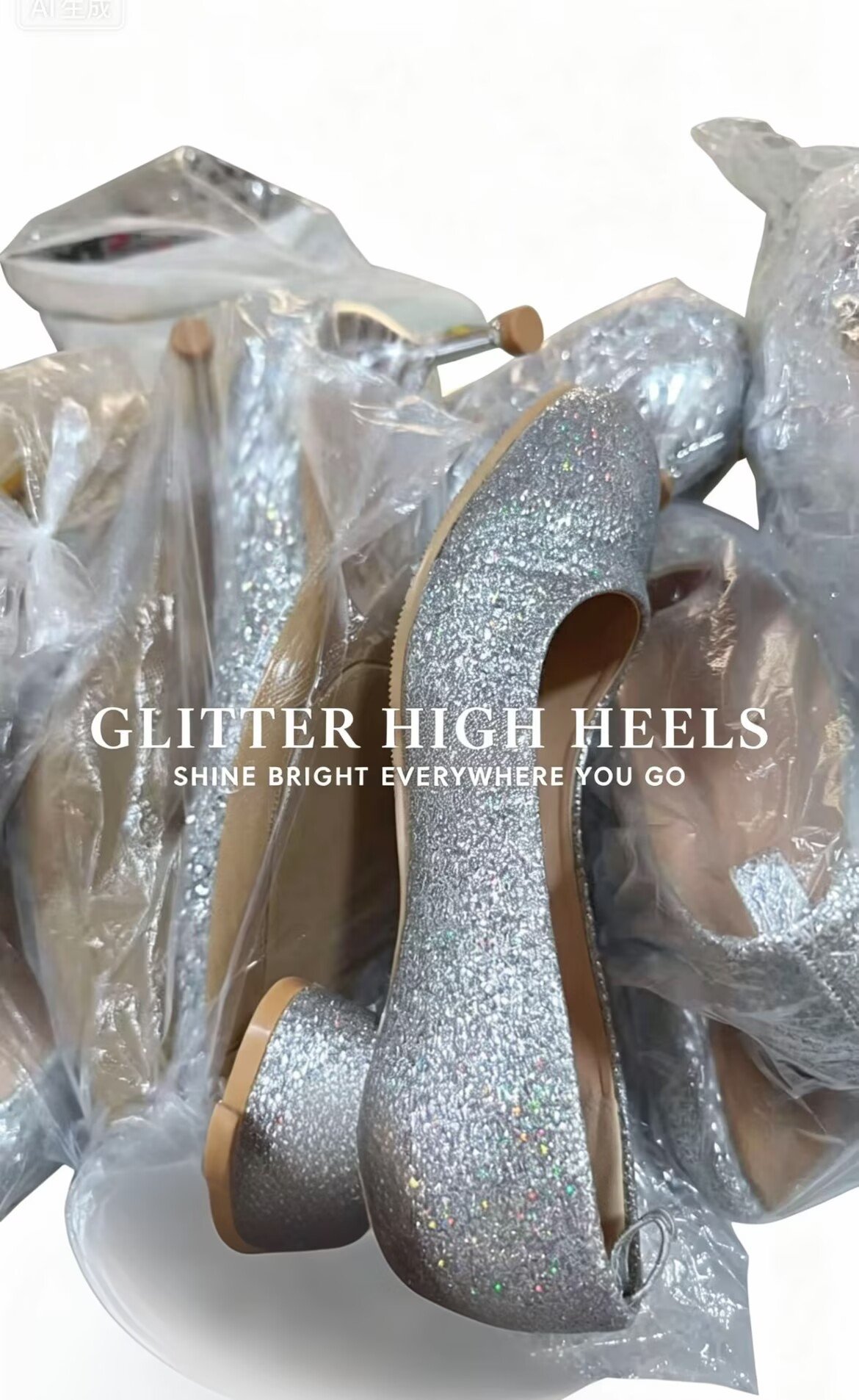 Perfect for parties, weddings, and special occasions, these heels feature a sparkling glitter finish and a comfortable block heel.