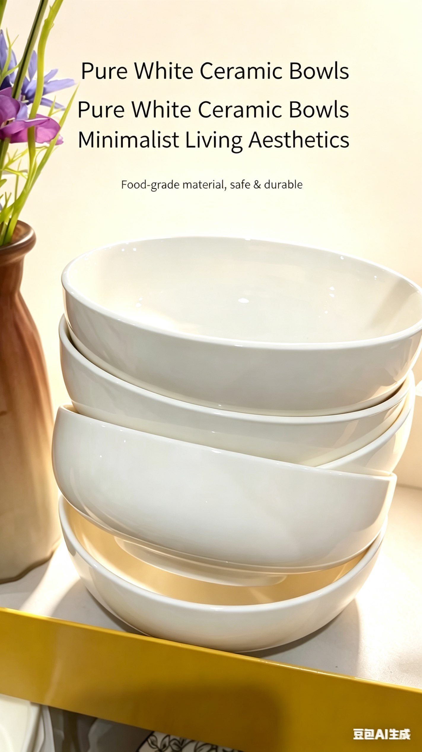 Minimalist pure white ceramic deep plates/bowls. Versatile design works as soup bowls, noodle bowls, salad bowls, or baking dishes. High-temperature fired glaze is smooth, non-stick, and easy to clean. Food-safe, odor-free, and stackable for space-saving storage. A kitchen essential for every home.