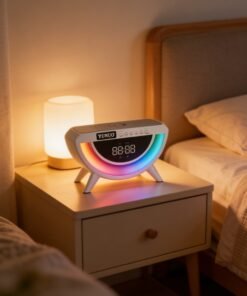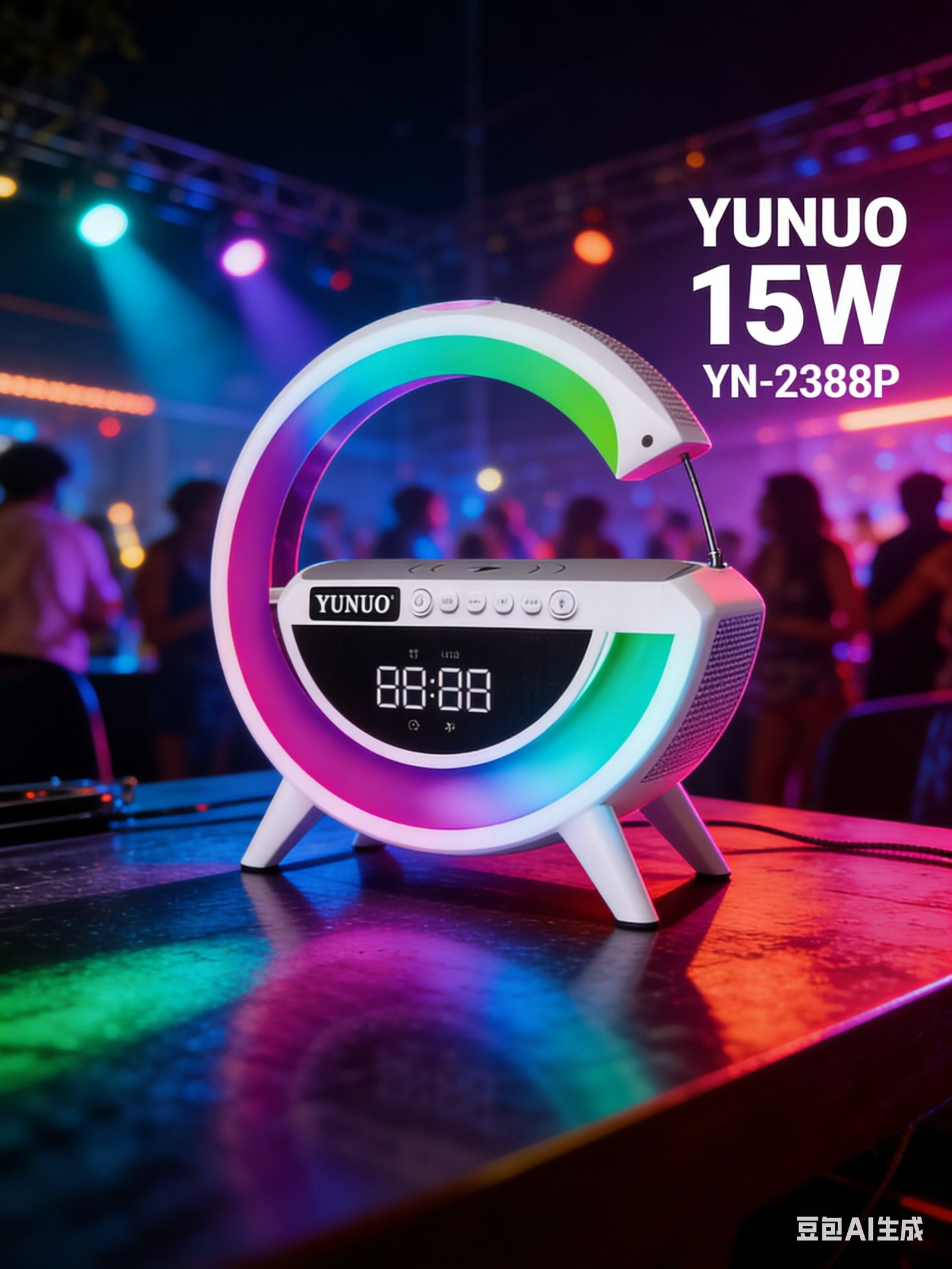 YUNUO YN-2388P 是一款集15W大功率蓝牙音箱、15W无线快充、RGB氛围灯(带舞台魔球)、数字时钟于一体的多功能桌面智能设备。采用潮流G型外观设计,颜值与实力兼具,完美适配居家、办公、派对等全场景。